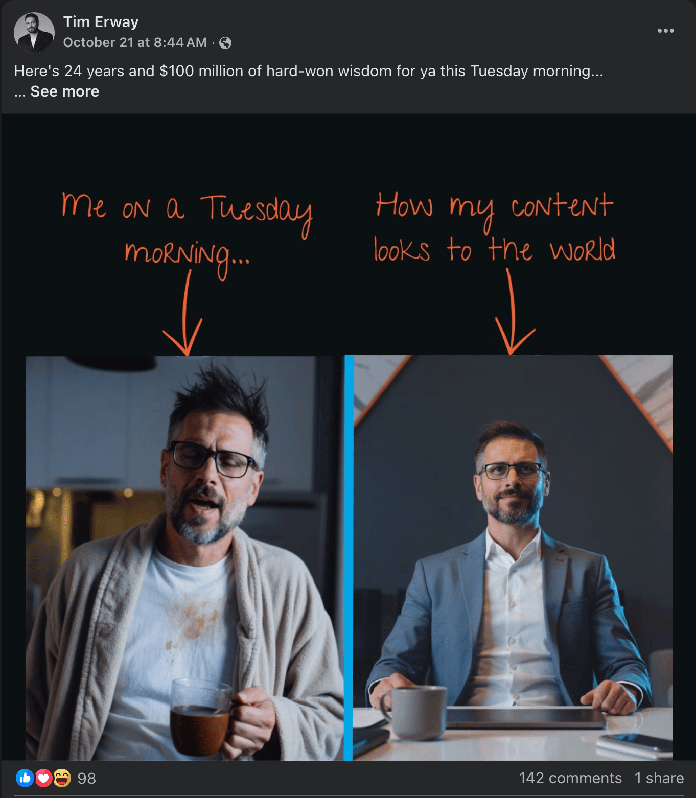 (Just a simple post with that coffee-stained shirt vs. polished content comparison.)